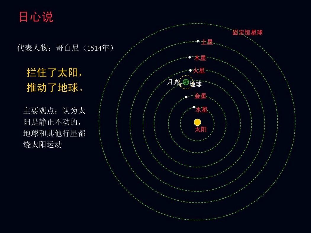 日心说认为,地球不是宇宙的中心,也不是固定不动的,所有的行星都以太阳为中心,地球只不过是饶太阳运行的一个普通的星球而已。