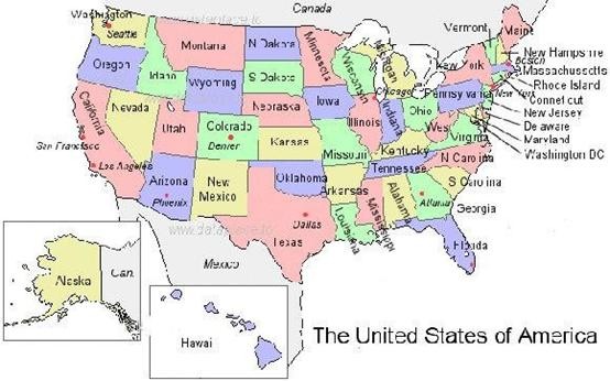 美国设州领土还包括北美洲西北部的阿拉斯加和太平洋中部的夏威夷群岛。北与加拿大接壤,南靠墨西哥湾,西临太平洋,东濒大西洋。本土东西长4500公里,南北宽2700公里,海岸线长22680公里。在北美洲西北角,有一块广袤的土地,它东邻加拿大,西濒白令海峡,南北是浩瀚的太平洋和寒冷的北冰洋。这就是美国的第49州——阿拉斯加州。它原来并非美国领土,而是从俄国手中廉价买来的。