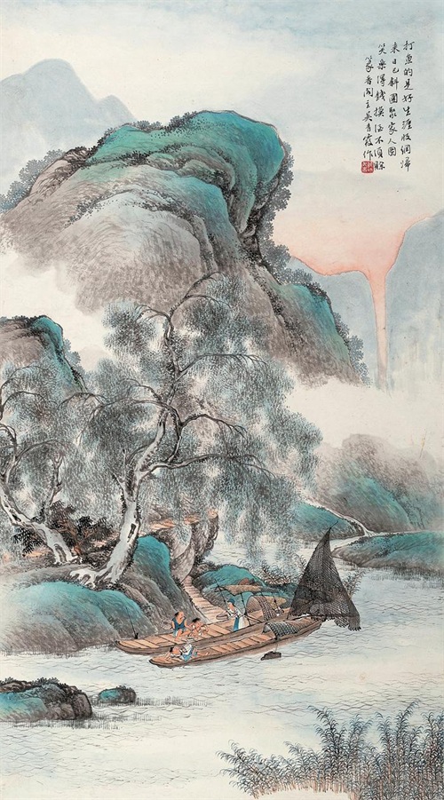 题识:打鱼的是好生涯,收网归来日已斜。团聚家人图笑乐,得钱换酒不须赊。篆香阁主吴青霞作。