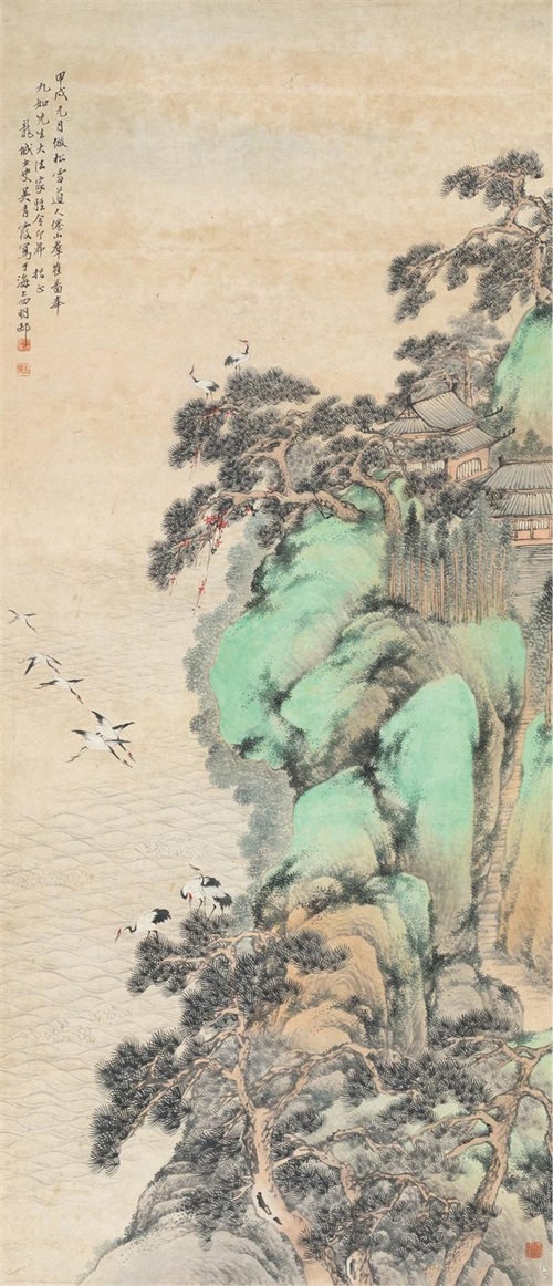 题识:甲戌元月,仿松雪道人《仙山群峰图》,奉九如先生大法家雅令,即希指正,龙城女史吴青霞写于海上四明村。