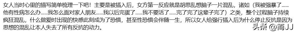 X暴力的文化背景:性行为中的强迫、压迫或不平等是性别不平等的直接表现。X暴力和强迫性交的受害者往往面临心理和生理上的双重困境。在不自愿的情况下,女性可能会表现出“冻结”反应,而这种反应可能被误解为“接受”或“停止反抗”,但它实际上并不意味着同意。权力与控制:性行为中的强迫往往涉及到一方的权力控制。性暴力中,施暴者通常利用身体力量、威胁、操控等手段迫使对方屈服。受害者的停止反抗,可能只是暂时的适应性反应,不代表她们愿意参与或接受。