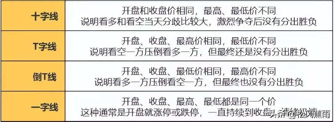 T字线,其开盘价、收盘价、最高价相同或基本相同,实体为“一”字,K线上只留下影线,如果有上影线也是很短很短。因形态很像英文字母“T”,故被称为T字线。