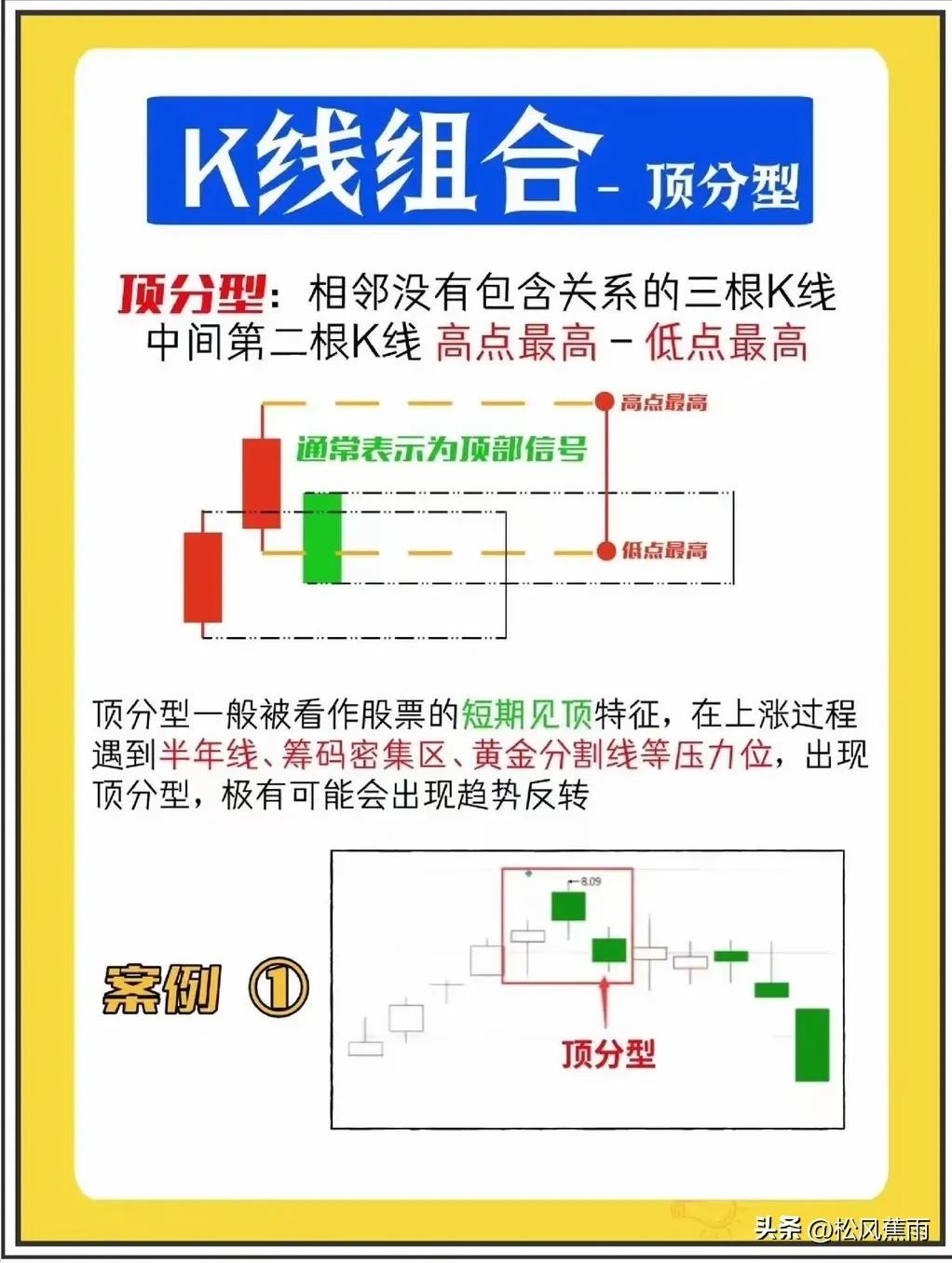 K线组合顶分型:相邻3根K线中,中间一根K线的高点与低点,是3根K线中高点和低点中的最高的。