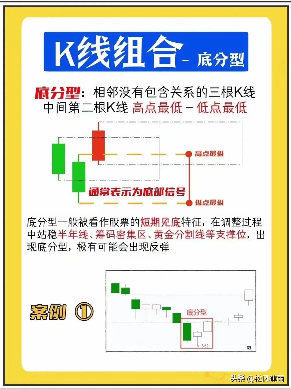 K线组合底分型:相邻3根K线中,中间一根K线的高点与低点,是3根K线中高点和低点中的最低的。
