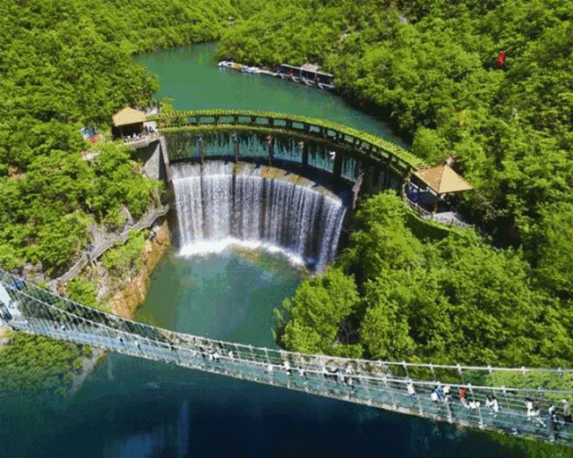 漫步玻璃桥上,五龙河大峡谷及天梦湖尽收眼底。行走其上彷如御风而,惊险无比。云深雾重之际,桥上悬空赏景漫步云端,如若"云中跳桥"。