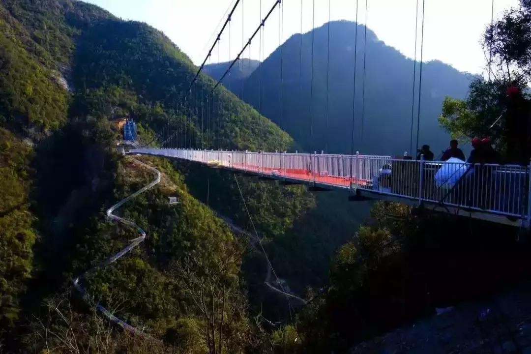 玻璃桥长约300米,垂直高度达180米,是目前省内跨度最大和垂直高度最高的玻璃桥。