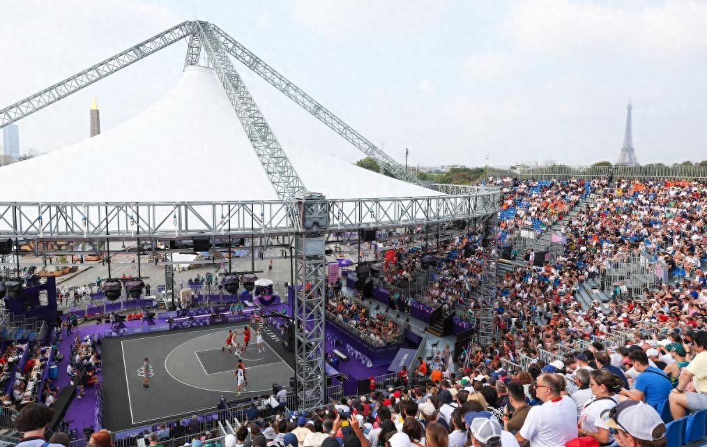2024年8月2日,观众在协和广场观看巴黎奥运会三人篮球男子分组循环赛。新华社记者 许雅楠 摄