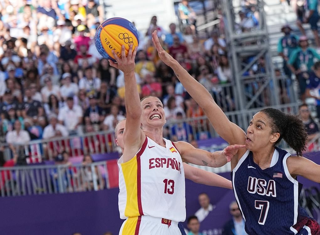 2024年8月5日,西班牙队球员伊格拉维德(左)在巴黎奥运会三人篮球女子半决赛中上篮。新华社记者 孟永民 摄