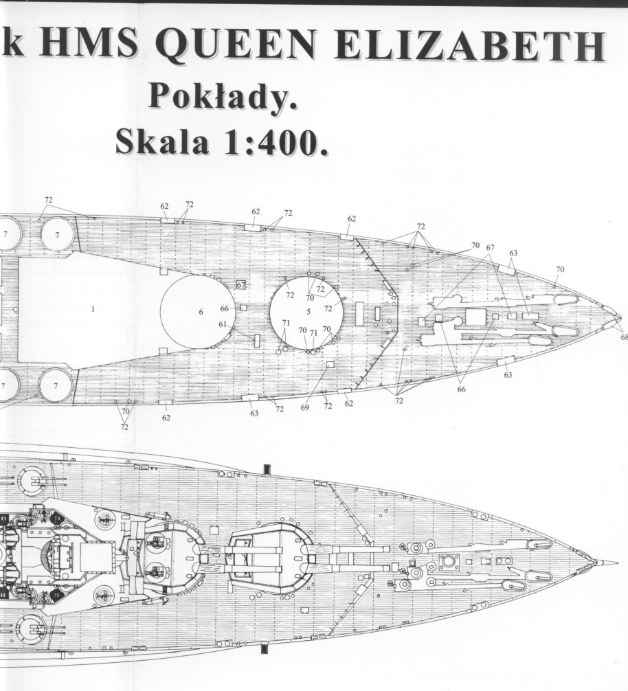 武备:8门双联装15英寸/42倍口径主炮,12门6英寸/45倍口径副炮,2门76毫米炮(1934年改装中马来亚号、厌战号加装双联装4英寸口径高射炮4座,加装八联装40毫米高射炮;1937年改装中勇士号、伊丽莎白女王号拆除副炮改装双联装4.45英寸口径高平两用炮10座,加装40毫米和20毫米高射炮.),533毫米鱼雷发射管4(改装中拆除)