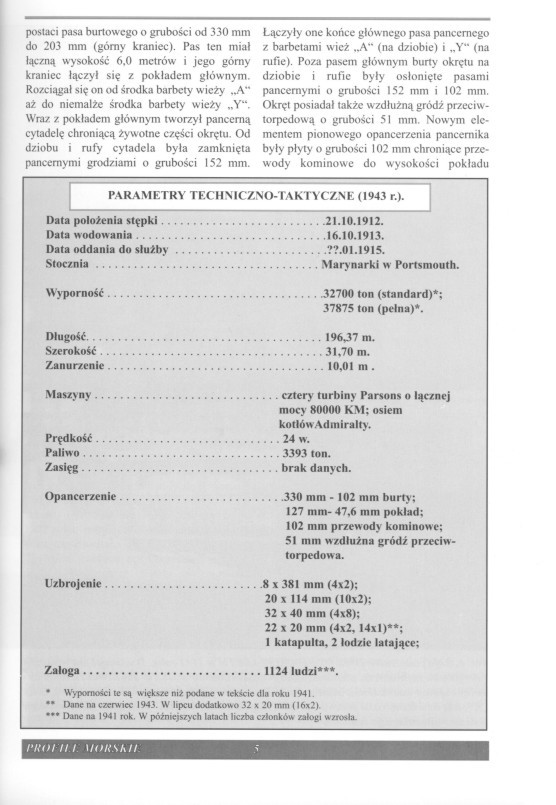 1912.10.21开工,1913.10.16下水,1915.1完工。建造船厂:朴次茅斯船厂。造价约240万英镑。1926年-1927年进行现代化改装。1937.8.6-1940.10进行第二次大规模现代化改装。1941.12.19在埃及亚历山大港内被炸沉(搁浅),1942.2打捞,1943.6在美国波士顿海军船厂修复。1946.8退役,1948年出售解体。