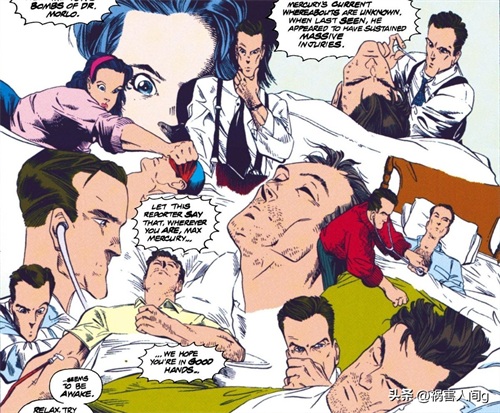这里,DC出现了一个BUG,在漫画《脉冲》中描写,马克思墨丘利在1947年从莫洛博士手中解救了阿拉巴马州的曼彻斯特小镇,但是他也被毒气弹烧伤了肺部。他幸运地被大卫克莱伯恩医生遇到,将他抬回了家中,大卫夫妇对马克思墨丘利进行了悉心的照料,很快马克思墨丘利就恢复了。