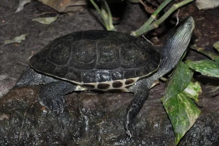 中华花龟在外观上头部较小,呈锥状的喙端带有细锯齿状,体扁平而三棱,有明显的脊棱。