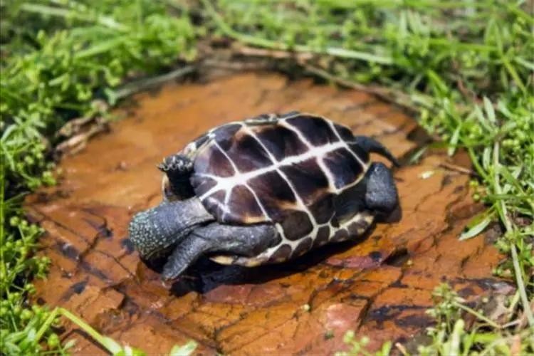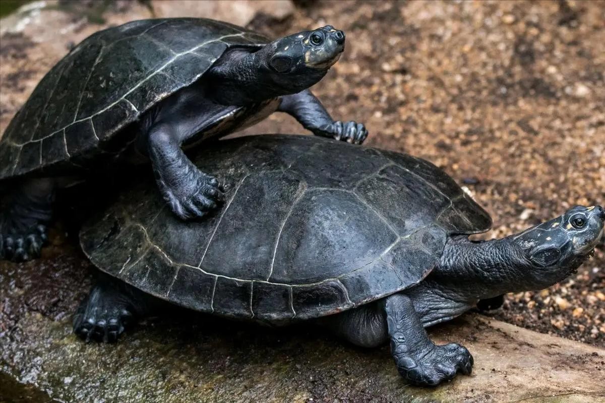 中华花龟进行体内受精,雌雄交配时的适宜气温为20~30℃。交配时,雄龟会爬到雌龟背上,交接器插入雌龟体内。