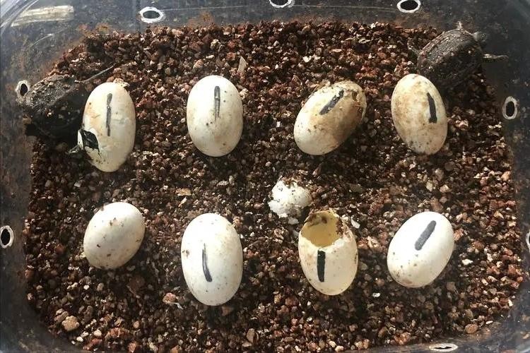 人工孵化时,将卵放置在沙盆或沙箱中,一层卵一层沙,表层也盖以沙,定期浇水保持湿润,然后将容器放置在室内,温度通常控制在28℃到33℃之间,大约63天左右,幼龟就会破壳而出。