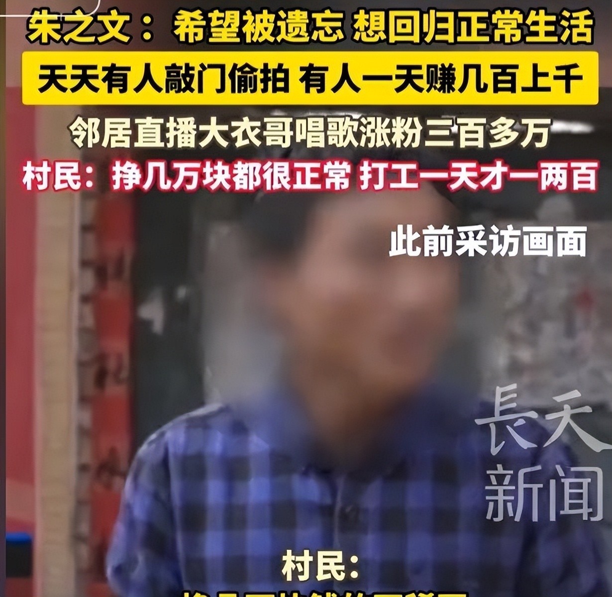 村民们拿着手机对着他不停地拍照,快门的声音就像针一样,让他感到难受。更有人直接把手机支在他家门口,全天候不停地录像,朱之文的个人生活完全暴露在大众眼前。
