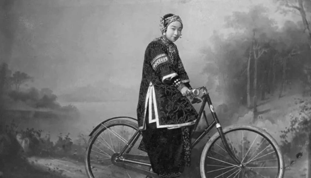 画面中,一位贵妇人正骑坐在一辆时髦的自行车上,姿态从容。