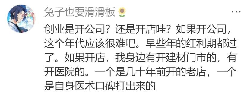 创业是开公司?还是开店哇?如果开公司,这个年代应该很难吧。早些年的红利期都过了。如果开店,我身边有开建材门市的,有开医院的。一个是几十年前开的老店,一个是自身医术口碑打出来的。