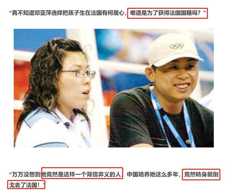 几年后邓亚萍的儿子林瀚铭加入北京乒乓球二队的消息一传出,立即在网上引发了一股猜忌和谩骂的狂潮。因为林瀚铭出生于法国,有人公然怀疑他已经获得了法国国籍,成为了"内奸"和"汉奸"的后代,本无资格代表祖国出战。