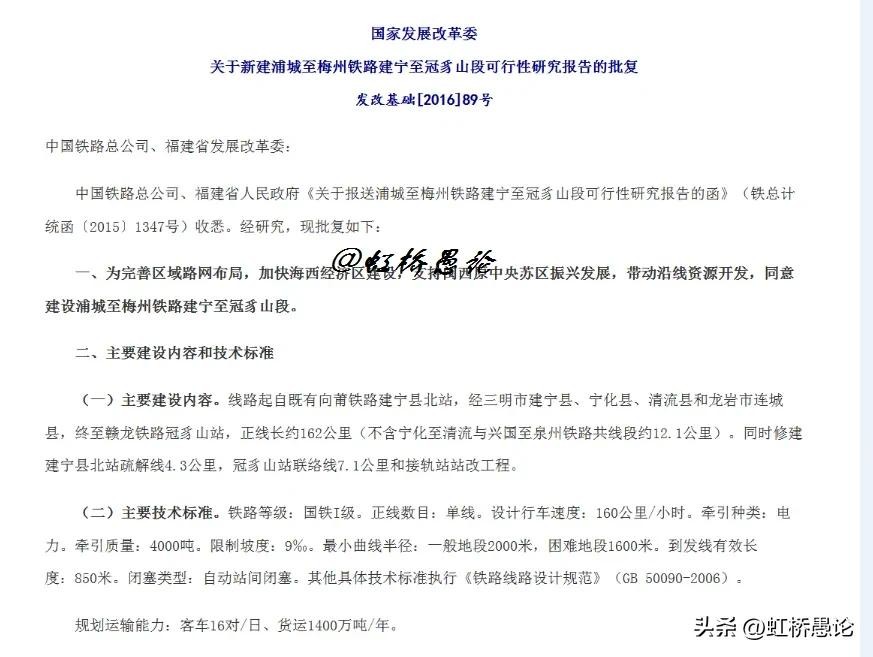 2016年1月15日,国家发展改革委关于新建浦城至梅州铁路建宁至冠豸山段可行性研究报告的批复正式下发。