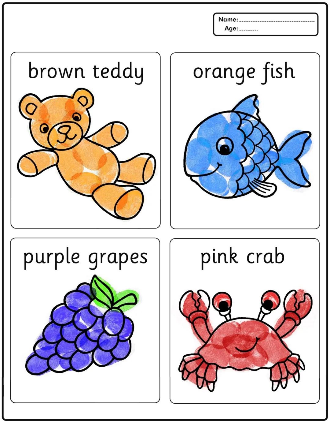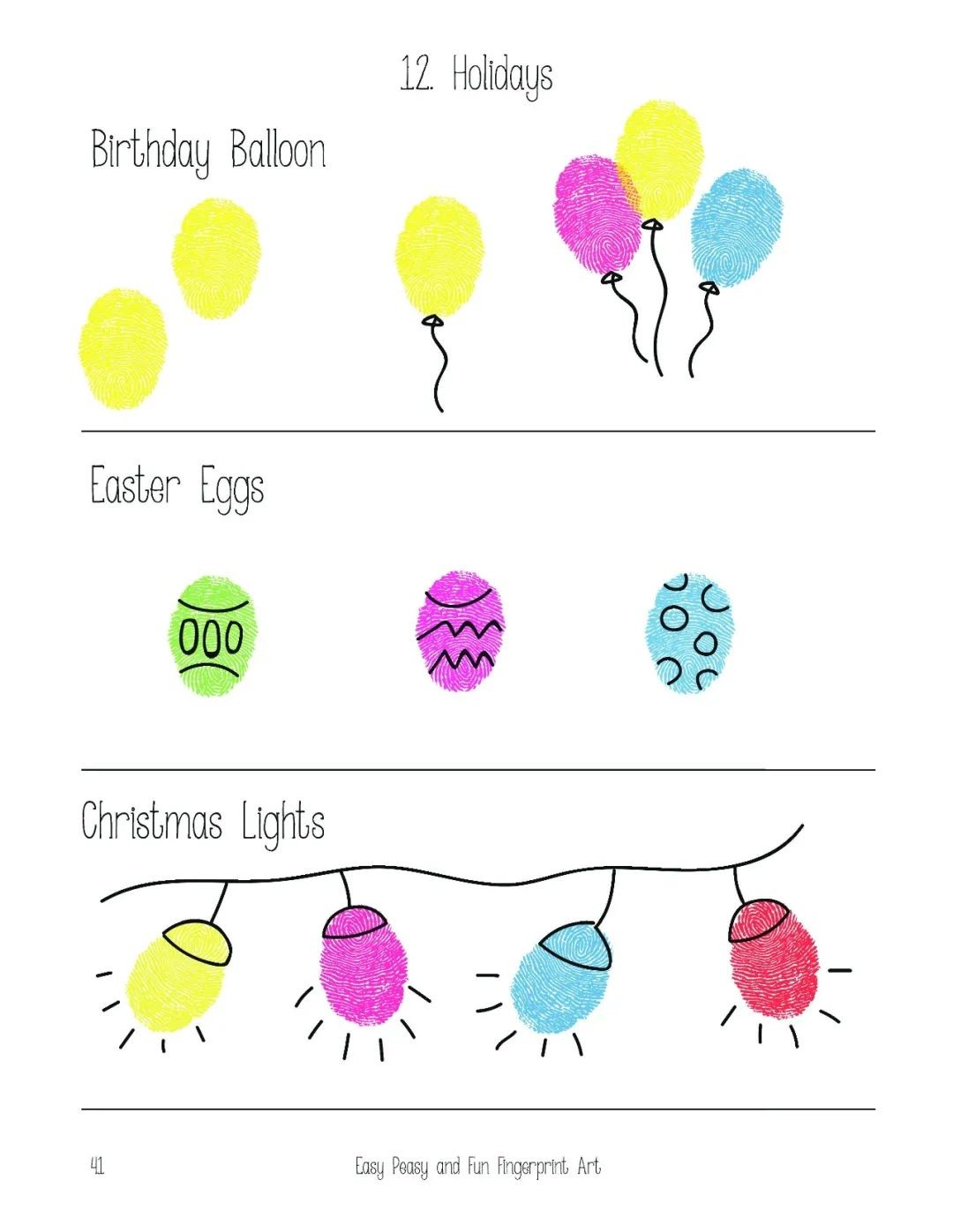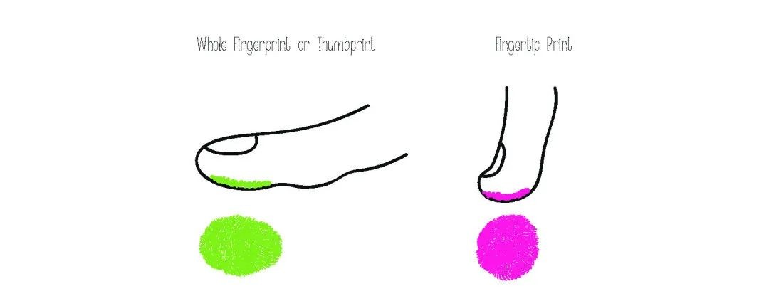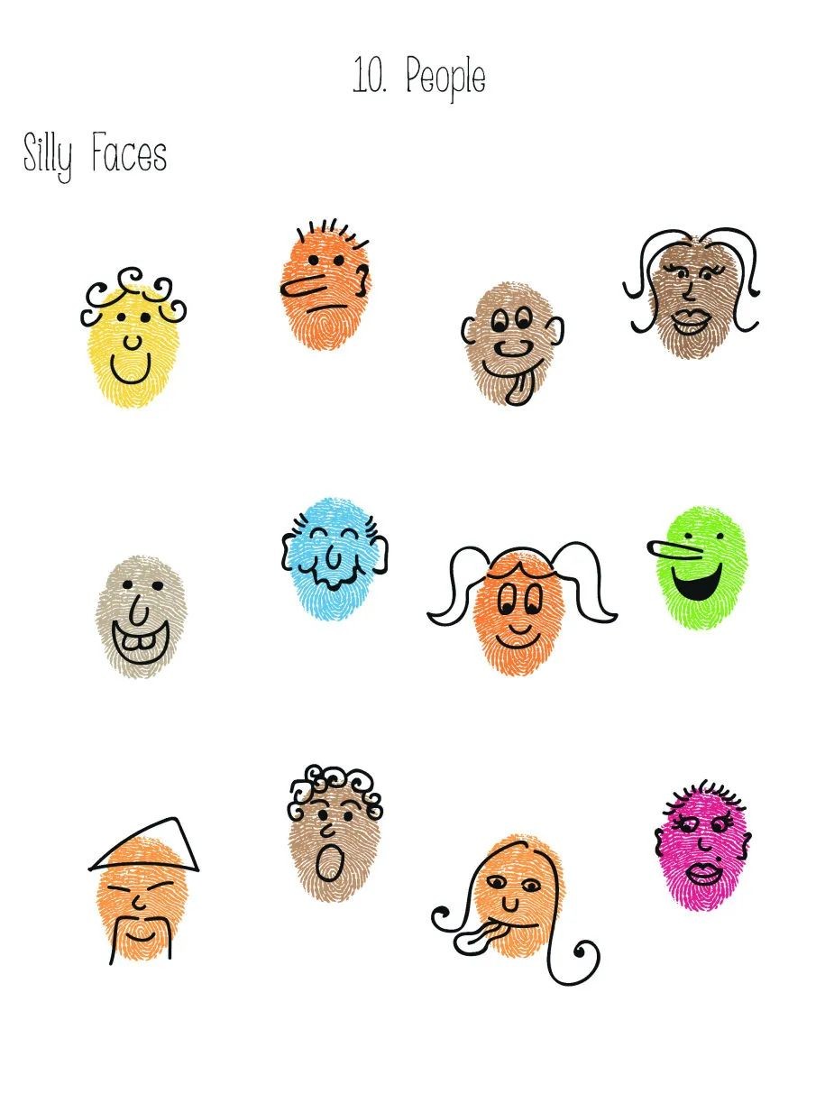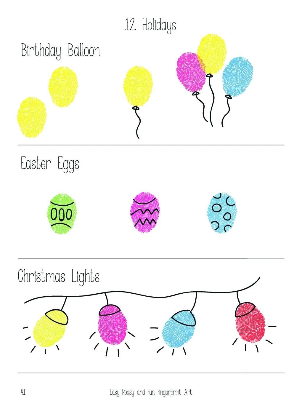 手指的螺纹面蘸色平按在纸上,画出的是椭圆形图样,适合画气球或人、动物的身体以及类似的形象。