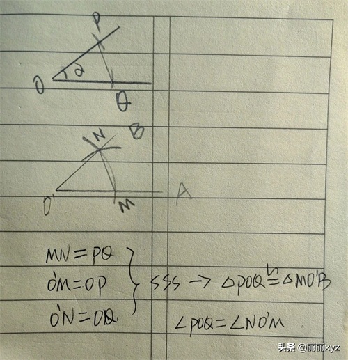 已知∠α,在∠α上以点o为圆心,以适当的长为半径作弧交∠α的两边于点P和Q;做射线O’A,以点O'为圆心,OP长为半径作弧交O'P于M,可以得到O'M=OP;以点M为圆心,PQ长为半径作弧与前弧相交于点N;连接PQ, MN可以得到MN=PQ;过点N做射线O'B,∠NO'M即为所求的角。