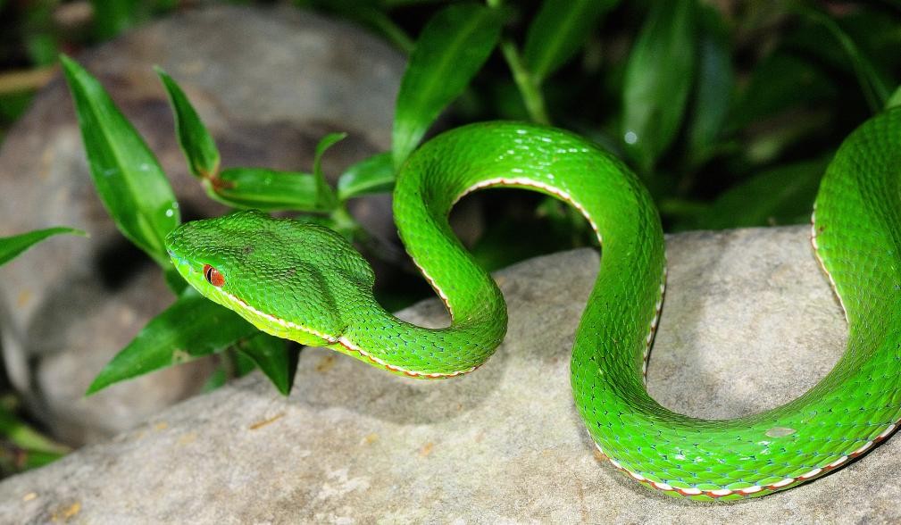 16.竹叶青蛇(学名:Trimeresurus stejnegeri)是蝰科竹叶青蛇属,为有毒蛇。生活习性:多于阴雨天活动,树栖性很强,具攻击性,耐饥饿能力较强。
