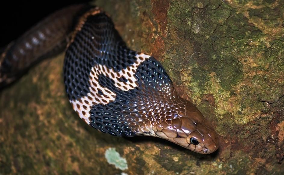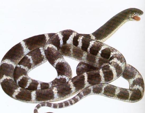 12.金环蛇(学名:Bungarus fasciatus)是眼镜蛇科,为有毒蛇。生活习性:喜阴暗,怕见光。著名食用蛇之一。