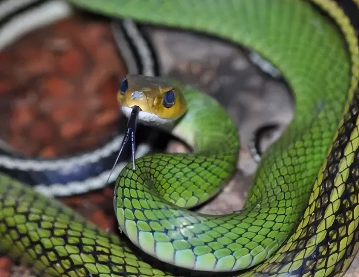 8.翠青蛇(学名:Cyclophiops major )属于游蛇科,为无毒蛇。生活习性:性格极其温柔,夜伏昼出,喜潮湿环境,主要捕食蚯蚓及昆虫的幼虫。