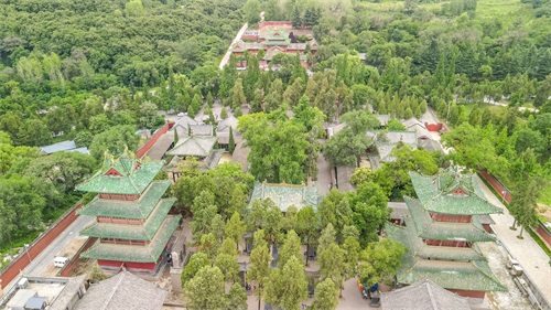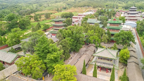少林寺的航拍图,寺内最高的建筑就是钟楼和鼓楼了,全部建筑都被绿植所覆盖,空气清新。