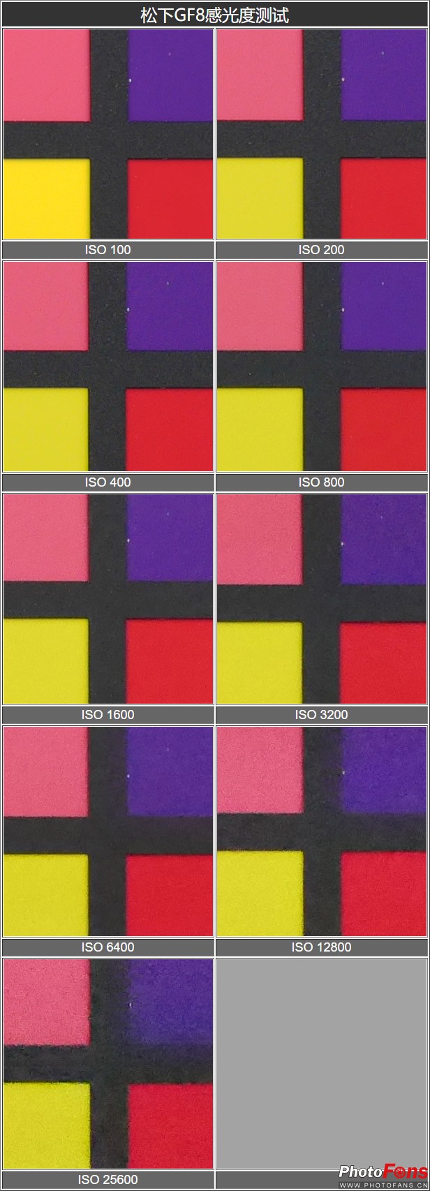 松下GF8搭M4/3规格的1600万像素Live MOS 传感器器和维纳斯引擎,原生感光度从ISO200-25600, 可扩展至ISO100–25600。下面我们就来看下实际的感光度表现。
