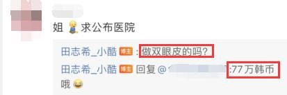 她回复称双眼皮是在韩国清潭洞某医院,做的埋线手术,花费了77万韩币(约为4348元人民币)。