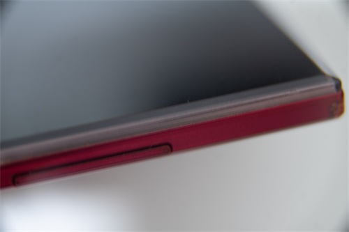 从侧面细看,可发现夏普402SH正面覆盖有一层厚度硬实的玻璃面板,且在机身四角形成坡度很高的切割角。夏普宣称这是一块新型的水晶玻璃触摸面板(其实就是亚克力),名为CRYSTAL DISPLAY技术。10mm厚的机身厚度,相信就是这块水晶玻璃在作祟。