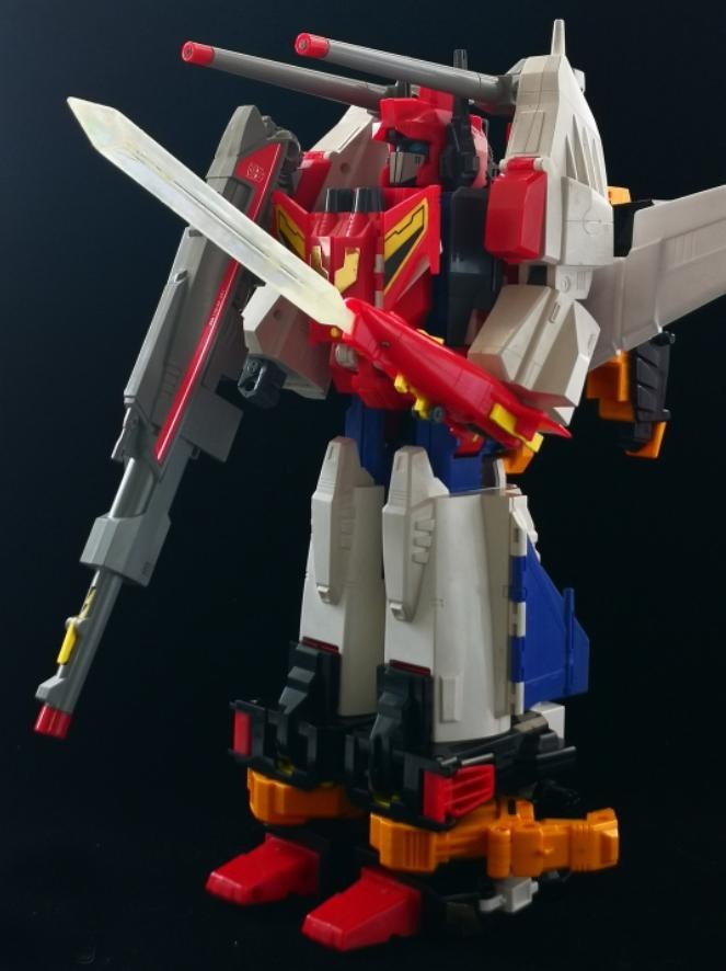 将史达(Saber)腿部简单折叠后就变成大机器人的胸部,然后将背后的大头拉伸扣上,皇者之剑史达(Star Saber)就完成了变形。