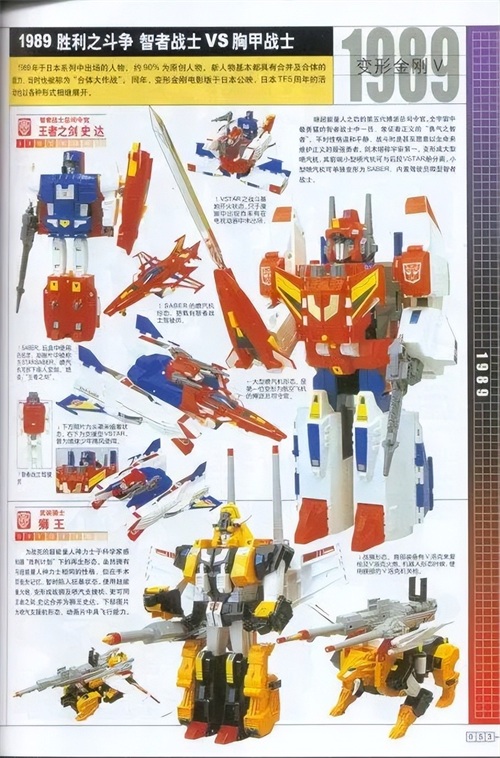 史达和狮王的名字在动画中的翻译其实挺混乱的,好吧,整部动画的人物名字翻译都挺乱的......实际上红色飞机变成的人叫做 “Saber” 直译过来就是军刀,却被翻译成了史达。而合体后的皇者之剑史达叫做 “Star Saber” 直译过来是星辰剑,也就是后续许多作品中出现过的变形金刚世界观中强大神器的名字。而狮王的英文名字是“Victory Lion”,是 “胜利狮” 的意思,和史达合体以后的狮王史达在当年的国配版动画里被叫做“皇者狮王”,实际上他的英文名叫 “Victory Saber” 翻译过来应该叫“胜利之刃”吧。所以本文中小编尽量将中文名字和英文名字一起介绍,以避免引起混淆。