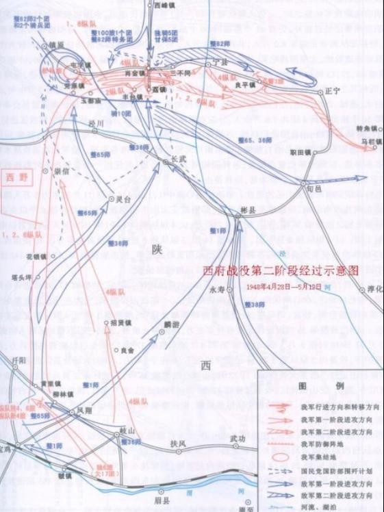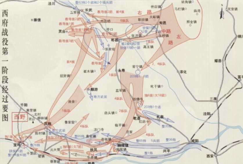 2、第1纵队为中路,攻占旬邑后经张洪镇渡过泾河,夺取邠县(今彬县)麟游、凤翔挺进,协同第2纵队相机夺取宝鸡。