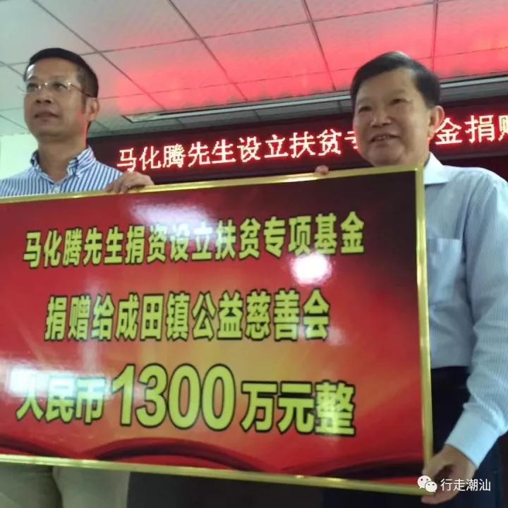 2017年马化腾捐赠1300万元给家乡,设立汕头市潮南成田镇公益慈善会扶贫专项基金