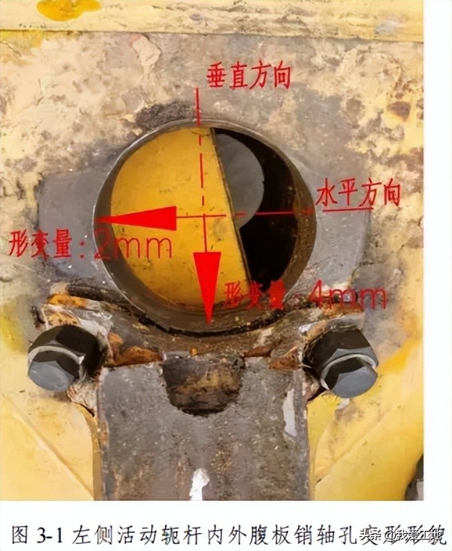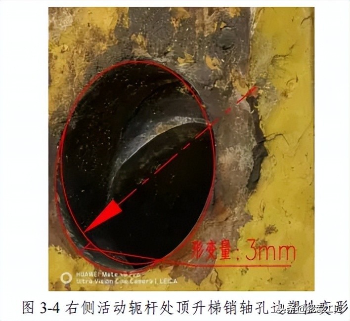 2.右侧顶升销轴处活动轭杆、顶升梯销轴孔形变(图 3-3、图 3-4)。