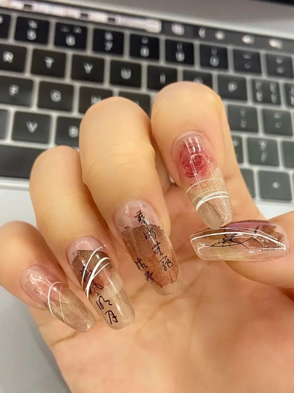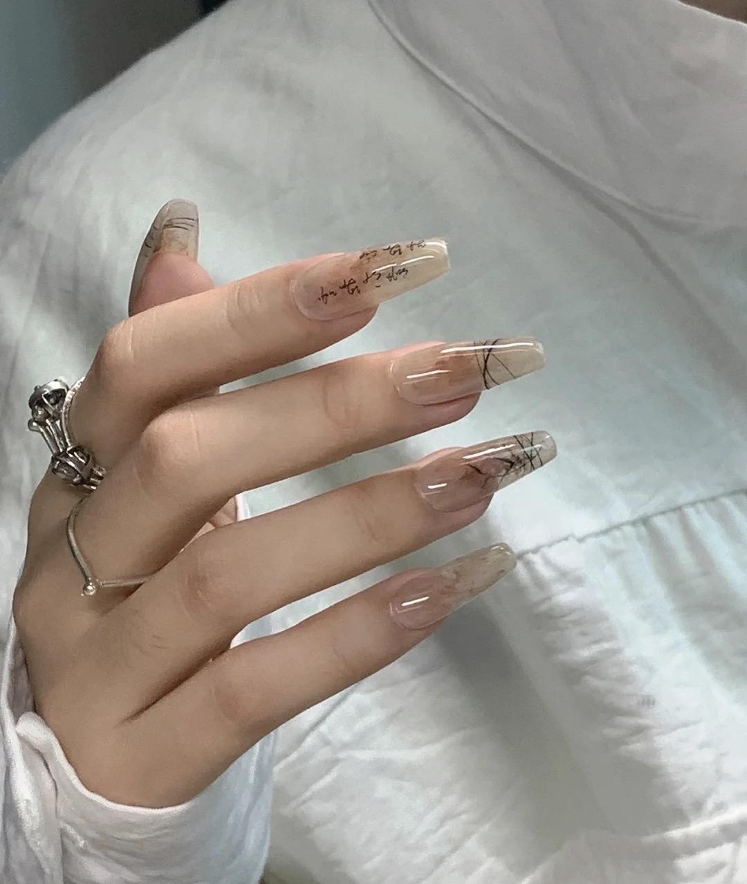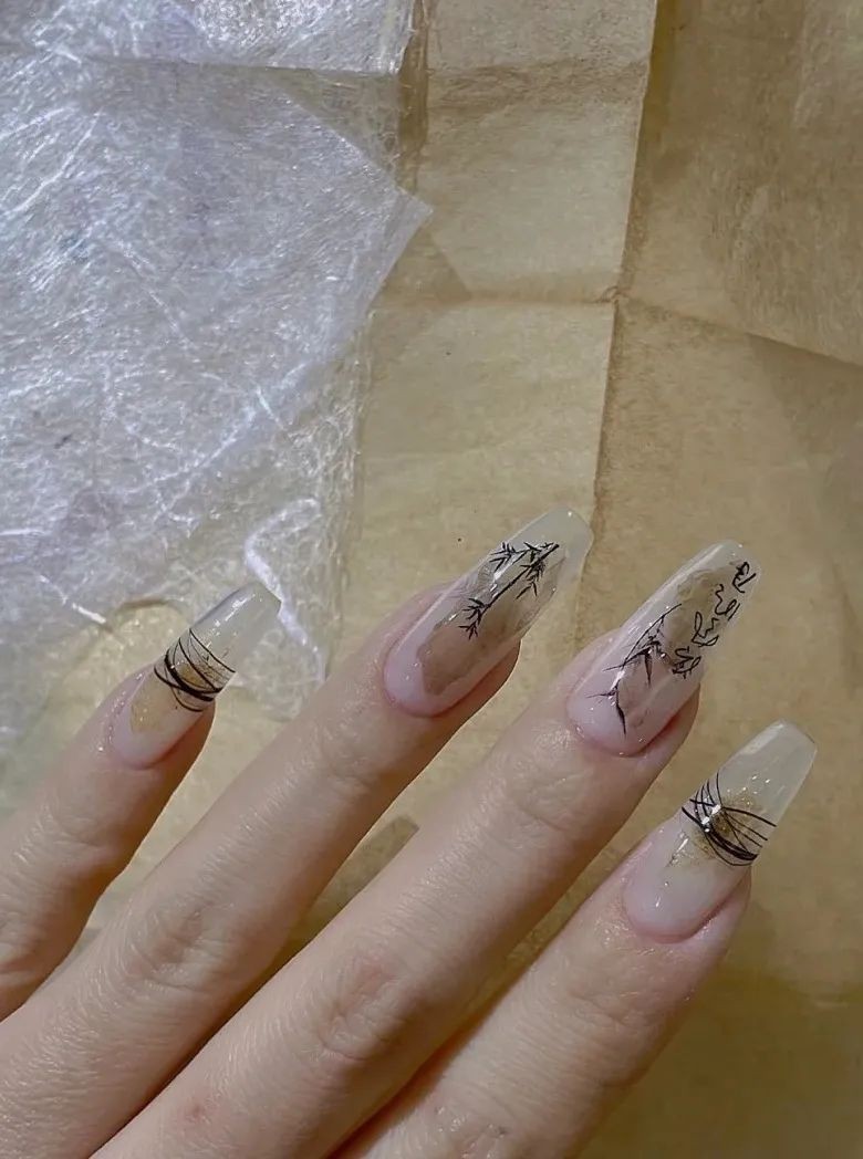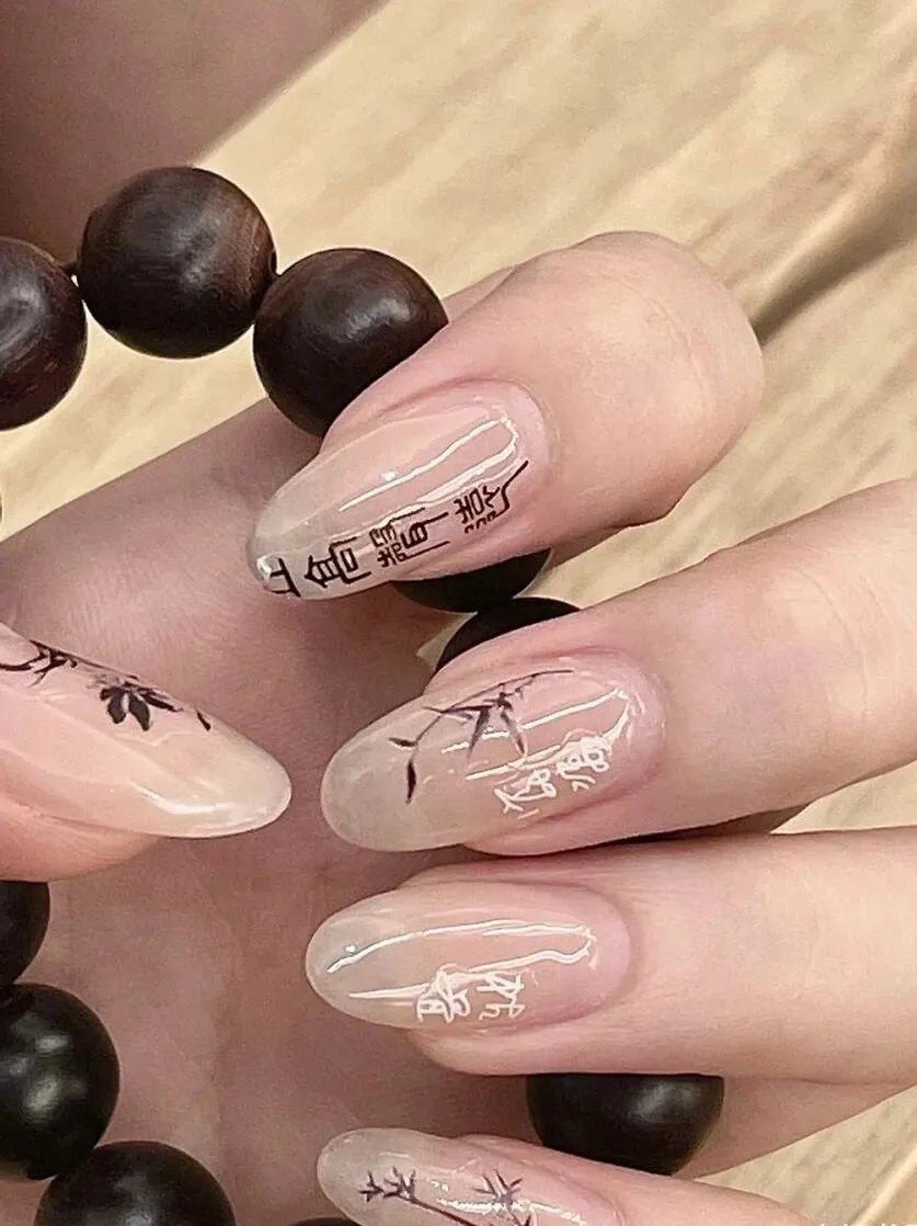 新中式美甲的感觉跟冰透甲其实差不多,不过新中式主要是添加一些文字和山水画的元素在里面,就形成了非常鲜明的中式风格。
