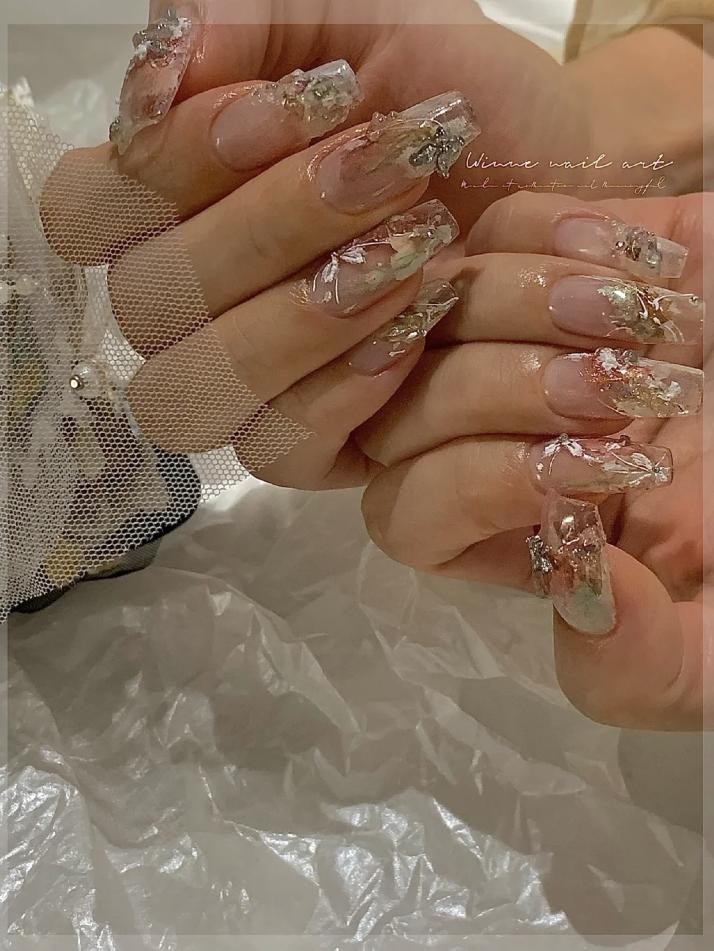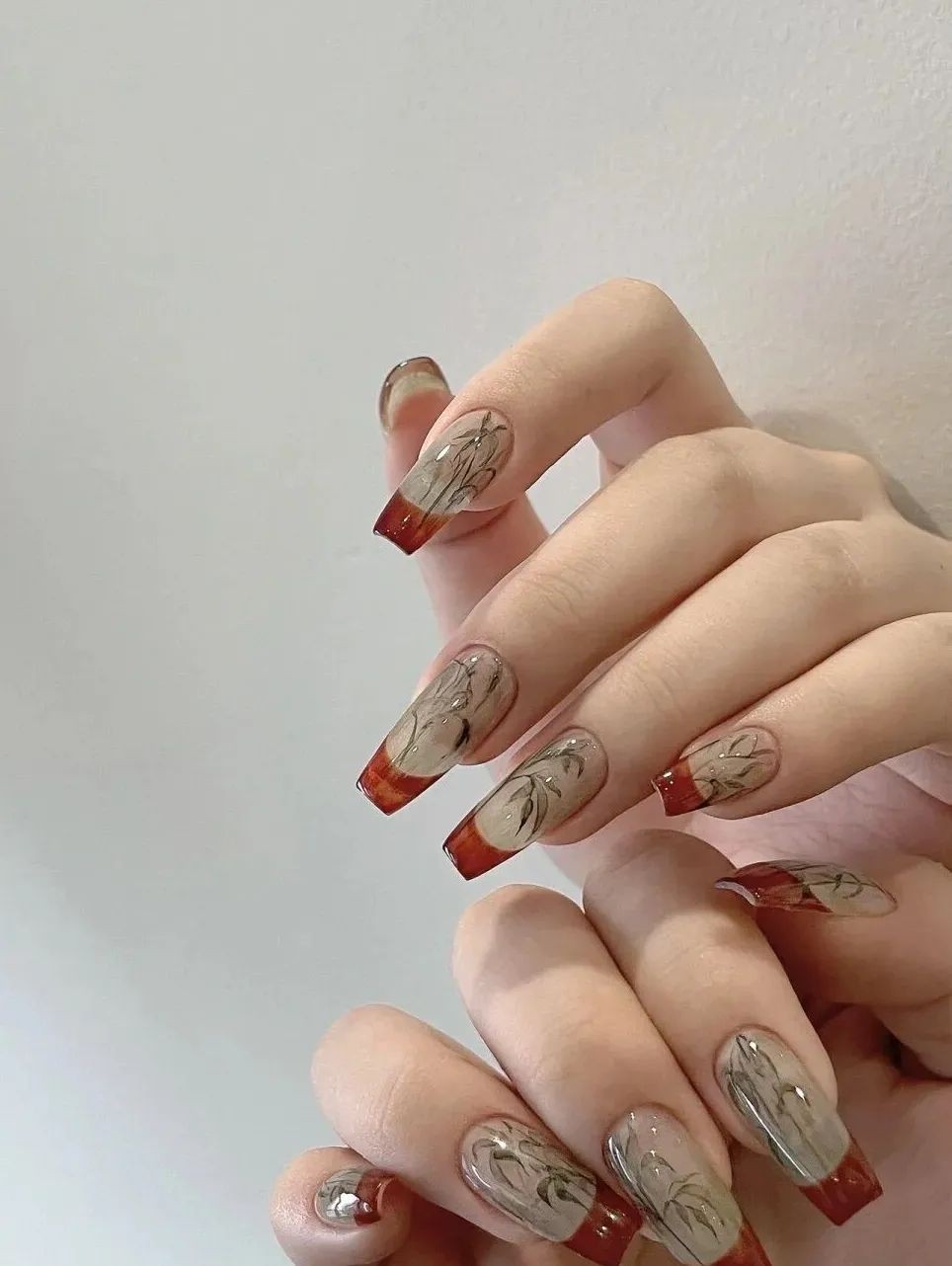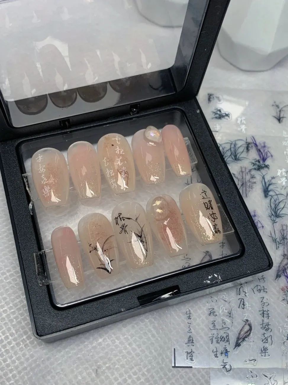 新中式美甲的感觉跟冰透甲其实差不多,不过新中式主要是添加一些文字和山水画的元素在里面,就形成了非常鲜明的中式风格。