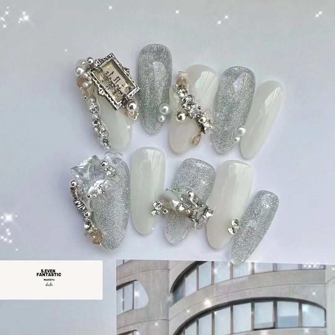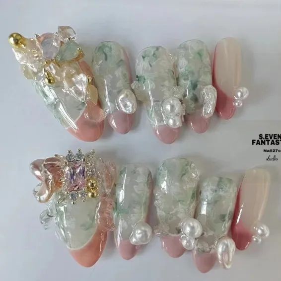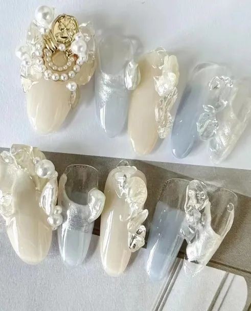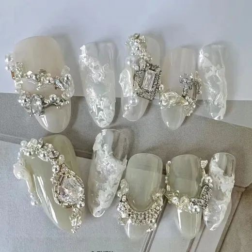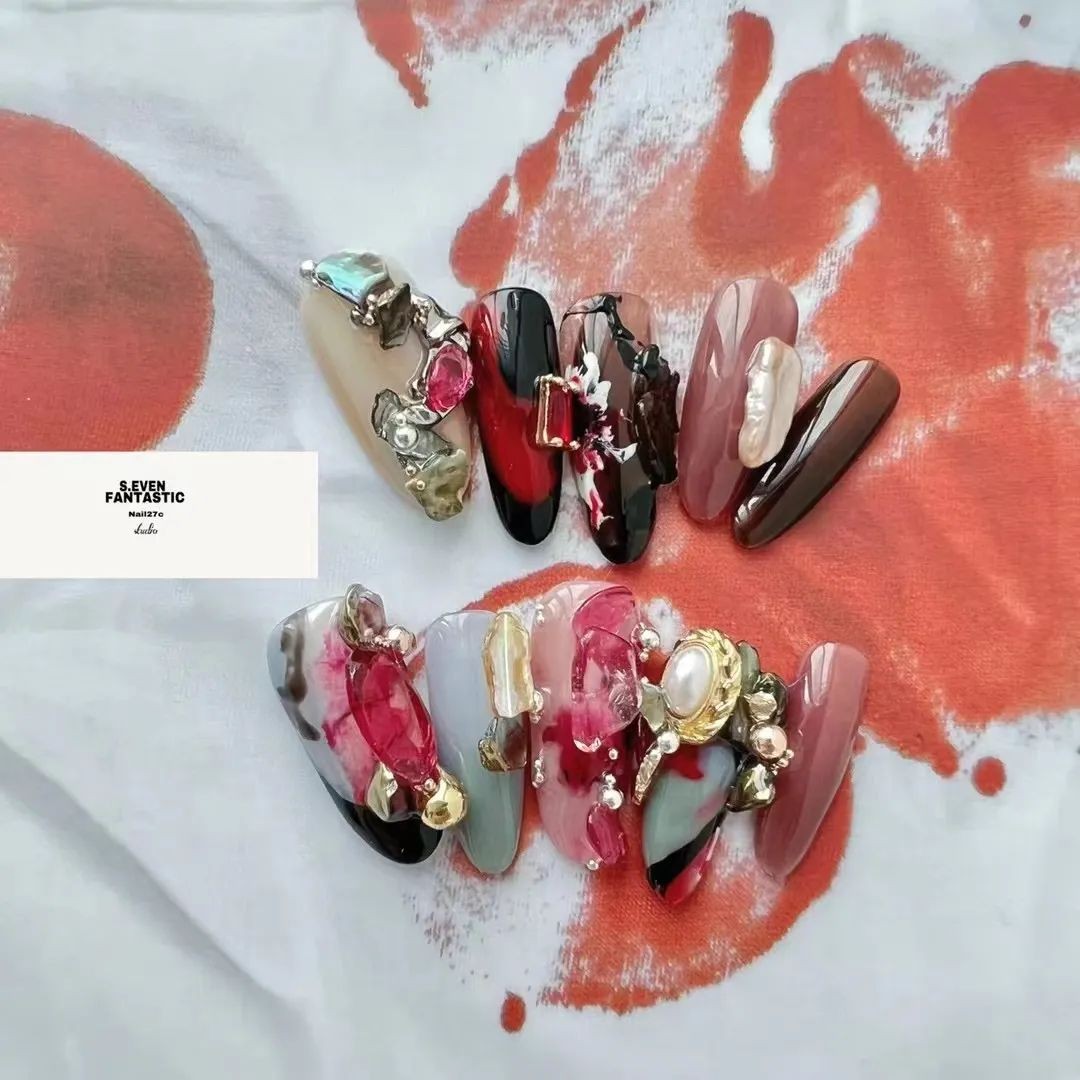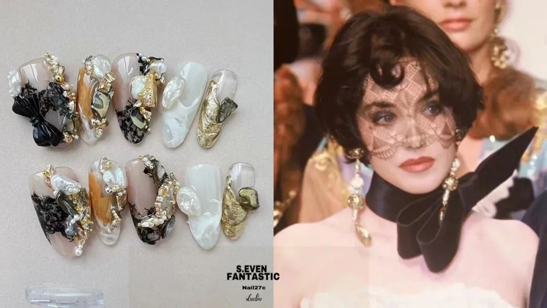 尤其是不规则珍珠排列成不规则的形状,跃然在指尖上就像一幅油画,像米色、纯白色这些饱和度极低的颜色,直接就能把复古感和温柔感拉满。