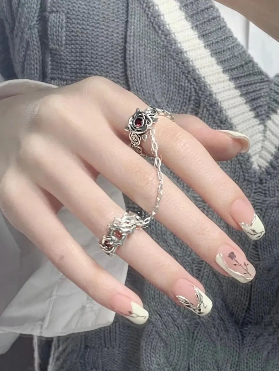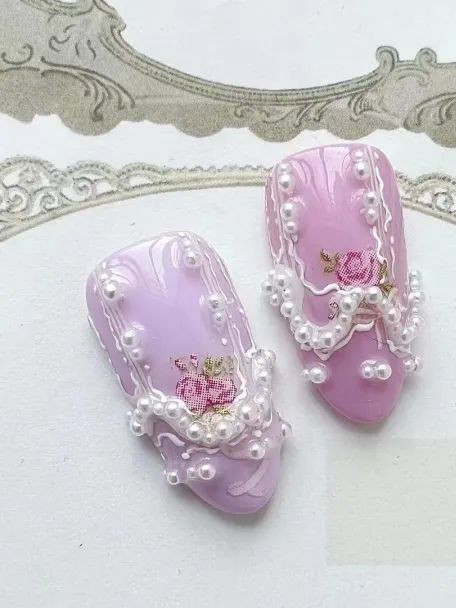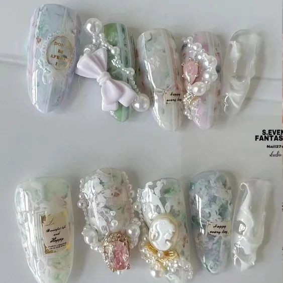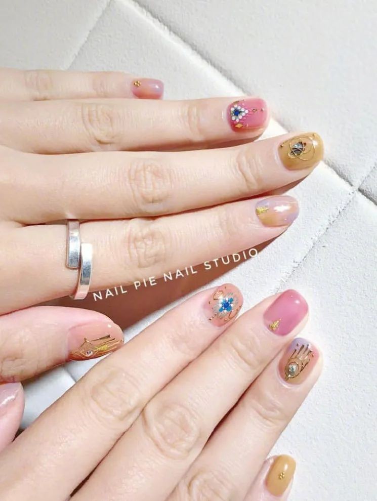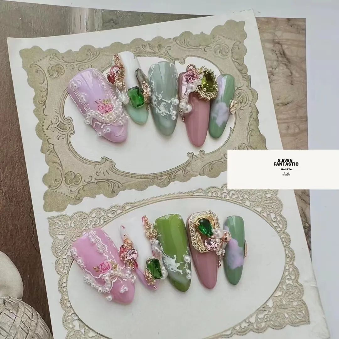 尤其是不规则珍珠排列成不规则的形状,跃然在指尖上就像一幅油画,像米色、纯白色这些饱和度极低的颜色,直接就能把复古感和温柔感拉满。