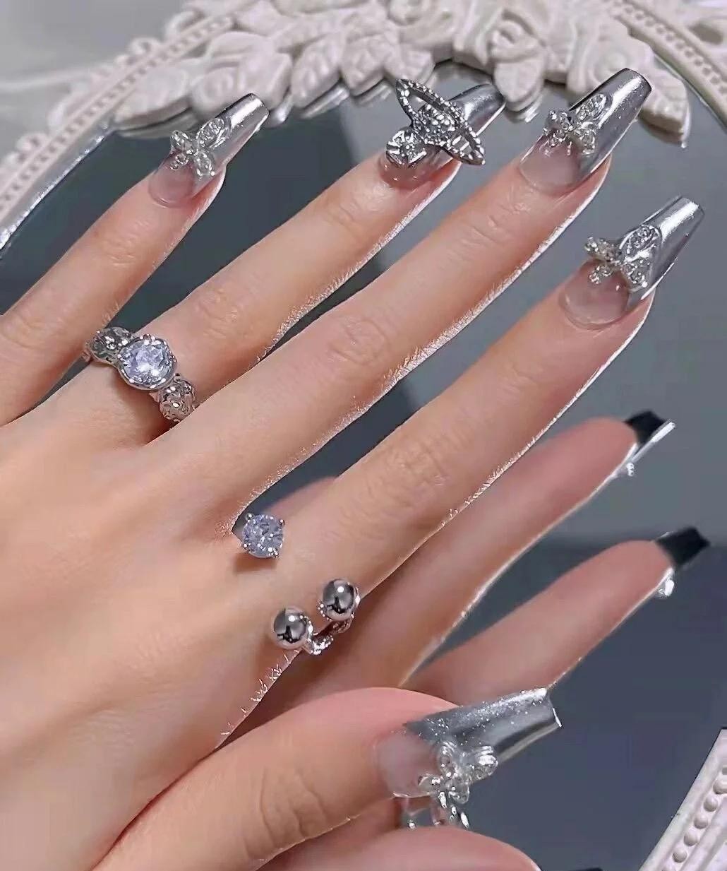 金属也是营造赛博朋克风的一大重要元素,喜欢这种独特风格的芋妮千万别犹豫,做了这款美甲,气场立马增高一米八,走在街上你就是最酷最辣的!