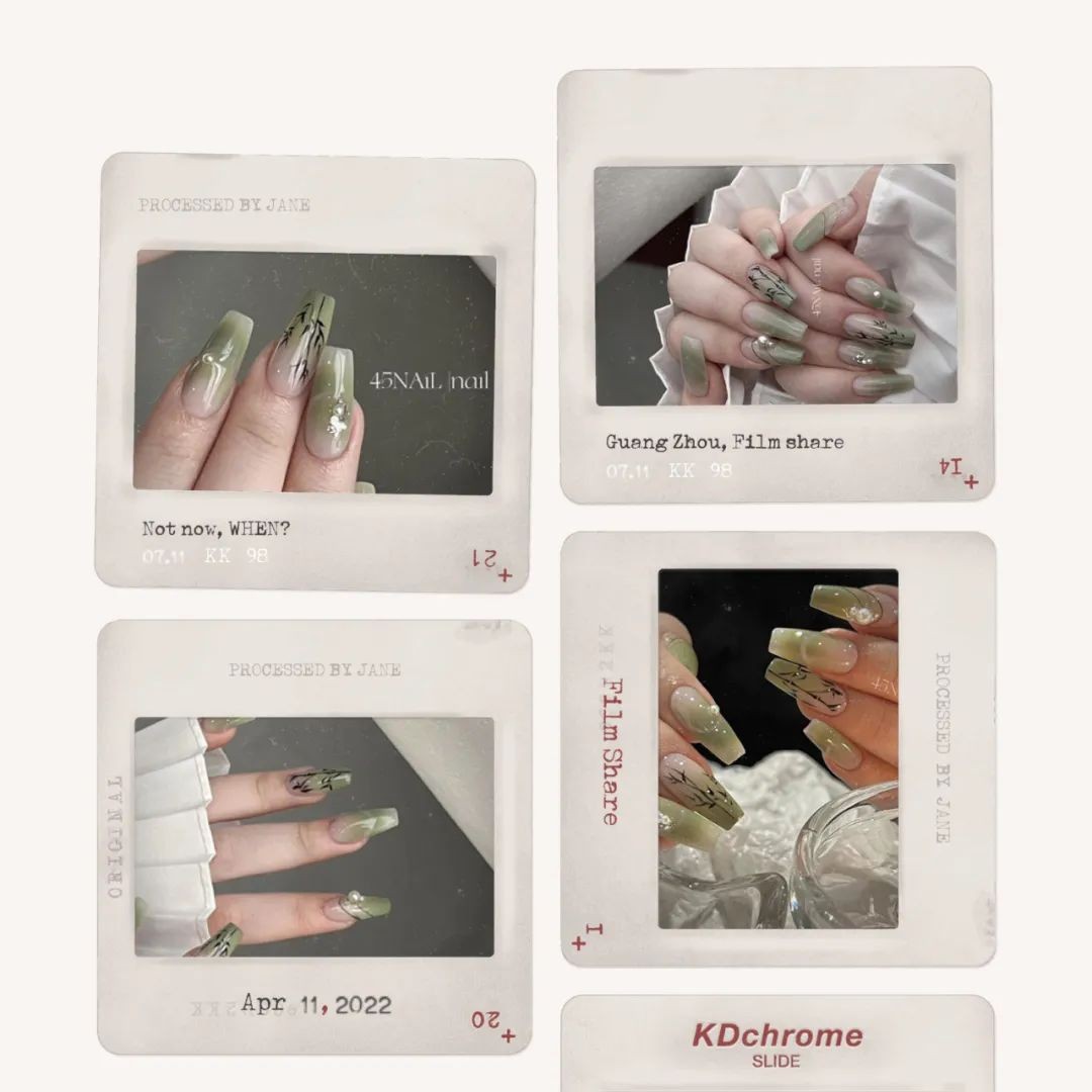 竹子也是新中式美甲的一大重要元素,翠绿的竹叶和一两颗玉石的点缀把雅致拉到了顶级,这么清凉的颜色,太适合夏天了吧!