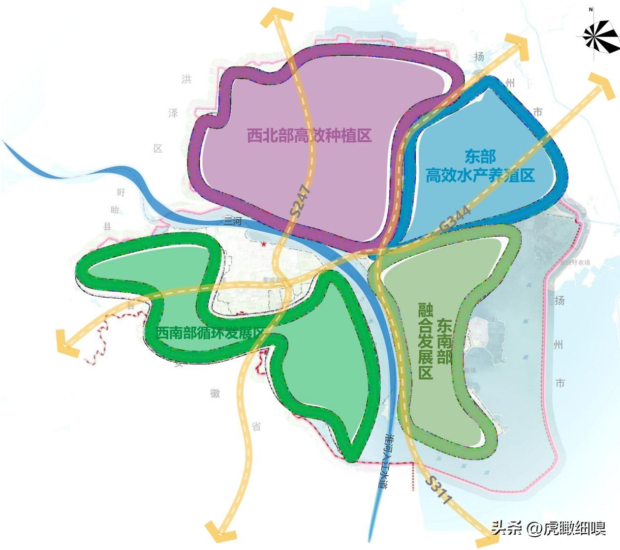 四区:即东南部融合发展区、 东部高效水产养殖区、 西北部高效种植区、 西南部循环发展区。