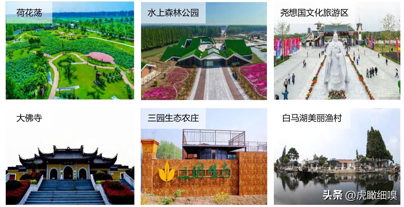 旅游景点:荷花荡、 水上森林公园、 尧帝古城、 大佛寺、 白马湖等。