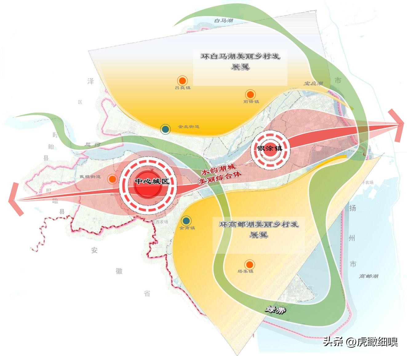 两翼:以吕良镇、 前锋镇为主构建环白马湖美丽乡村发展北翼;以塔集镇为主构建环高邮湖美丽乡村发展南翼。