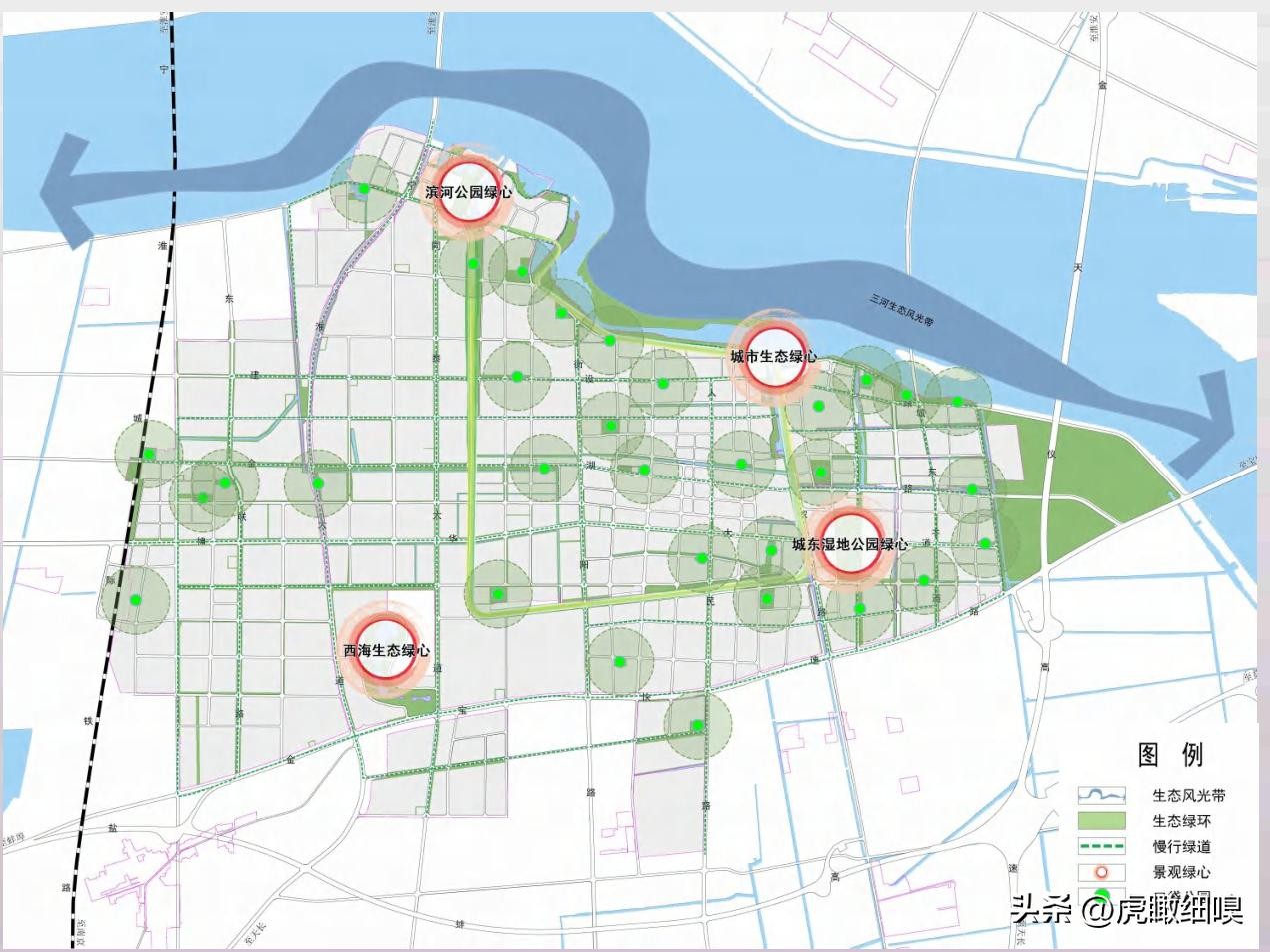 “三廊”:指淮河入江水道生态廊道、 白马湖引河生态廊道、 高邮湖生态廊道。依托水系, 城市绿带打造多层级廊道, 串联生态节点, 构建区域生态安全格局。