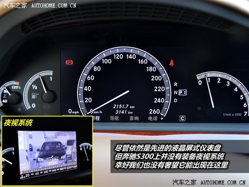 在这一代奔驰S级上市之初时,代表车辆最先进技术的夜视系统被作为卖点大加宣传,而我们在S500L 4MATIC也已见识过它能带来的夜间行车的便利性,但很可惜如此实用的高科技配置并不是S300L的标配,不过这也在我们意料之中,毕竟是入门级车型嘛。