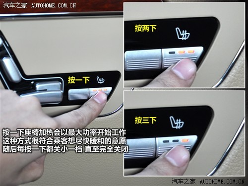 虽然座椅功能减少了,但我很欣赏奔驰在细节处的周到考虑,以座椅加热为例,通常车型所配的座椅加热都是从低档位到高档位逐次调节,而S级的正好相反,第一次按下按钮后,座椅加入启动最高的第三档,此时座椅会以最快的速度提高温度,设想一下,你从寒冷的车外进入车内,自然是希望尽快暖和起来,而S级恰好洞悉了你的心声。