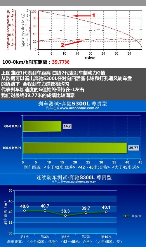 经过多次测试,最终我们只见到一个39米之内的成绩,但S300L的平均成绩却没能超过S500,不过39.77米的距离对于一辆自重近两吨的大家伙来说已经相当不错了,而且全程刹车力度都很均匀强劲,热衰性也没有明显体现,整体表现比较出色。